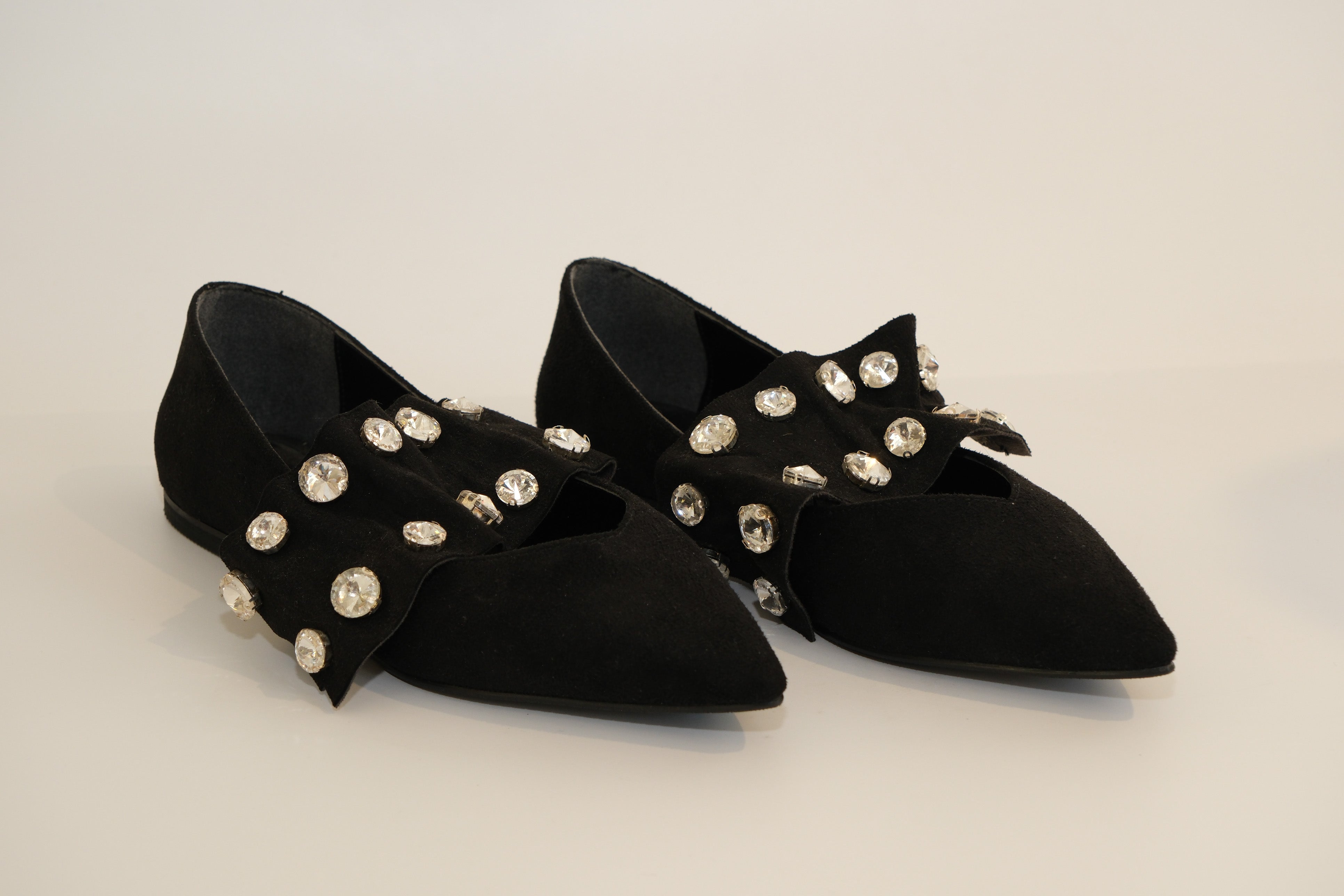 Günün her anında şık ve rahat bir stil sunan bu siyah sivri burun babet, büzgülü bant tasarımı ve zarif taş detaylarıyla göz alıcı bir görünüm yaratır. Hem klasik hem modern tarzlara kolayca uyum sağlayarak dolabınızın vazgeçilmezi olmaya aday!