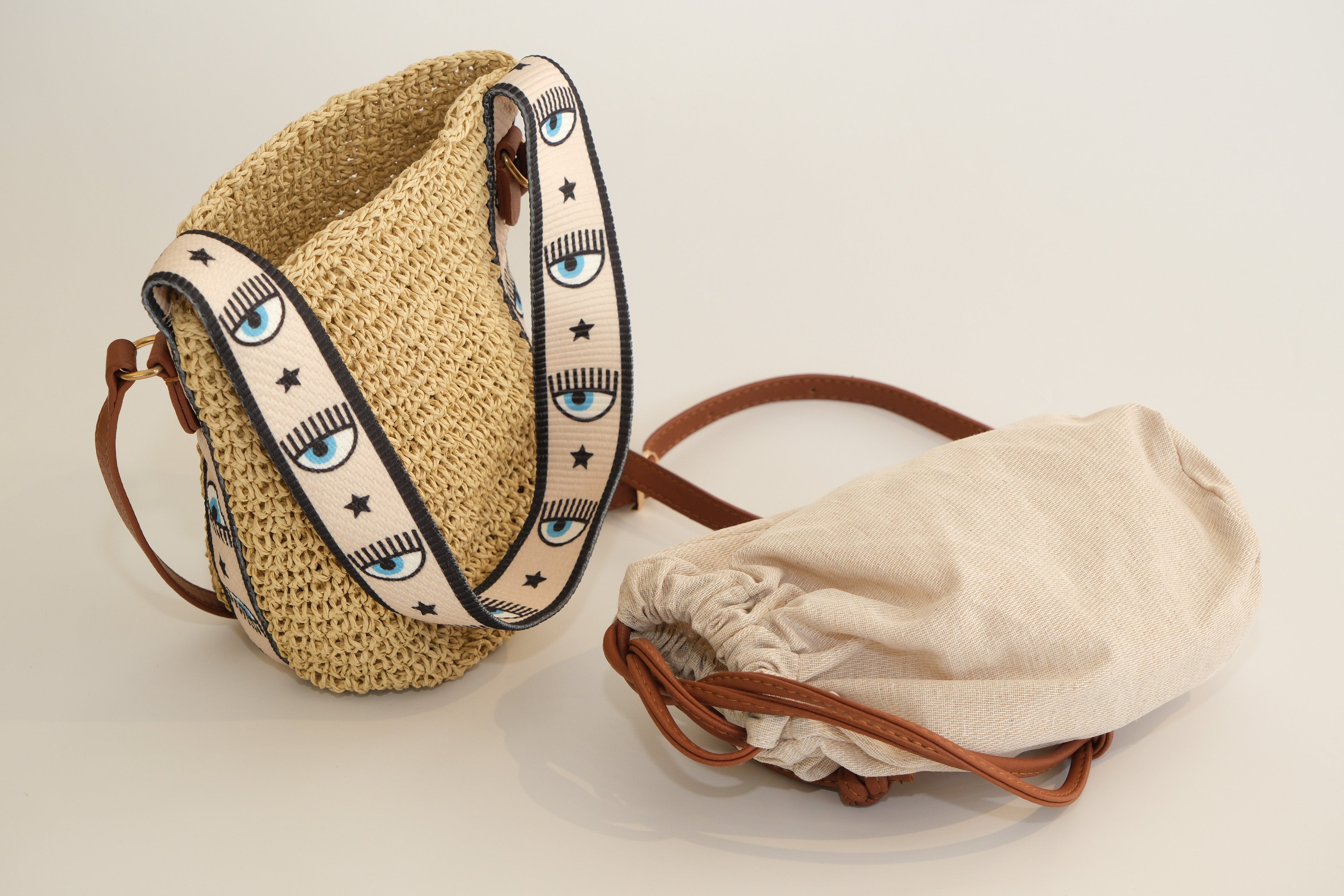 Şıklığı ve özgün tasarımı bir araya getiren bu keseli hasır çanta, sap kısmındaki dikkat çekici göz detayları ile fark yaratıyor. Doğal dokusu ve modern kesesiyle yaz stilinize eşsiz bir hava katar.
