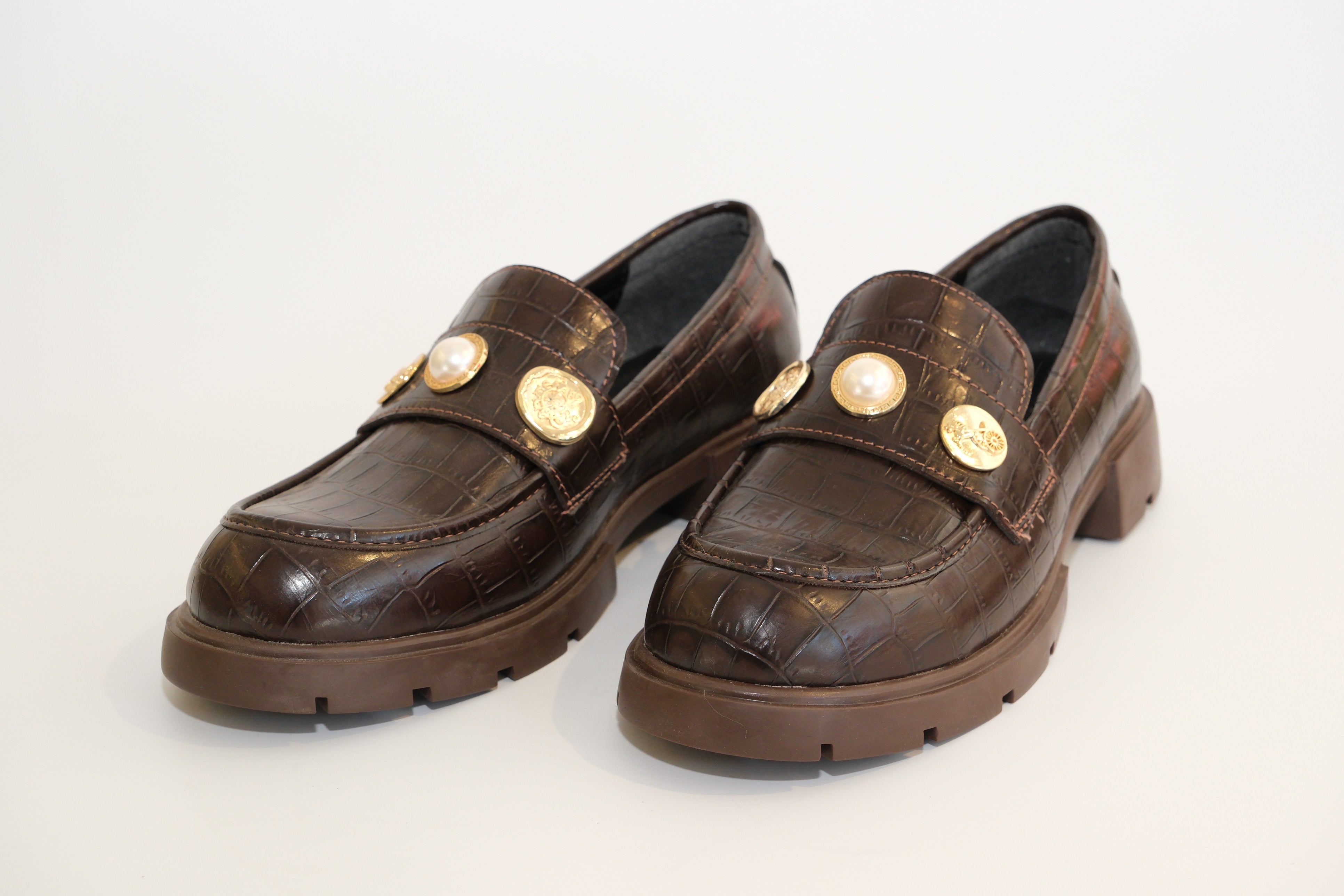 Kahverengi Deri Görünümlü Gold Süslemeli Loafer