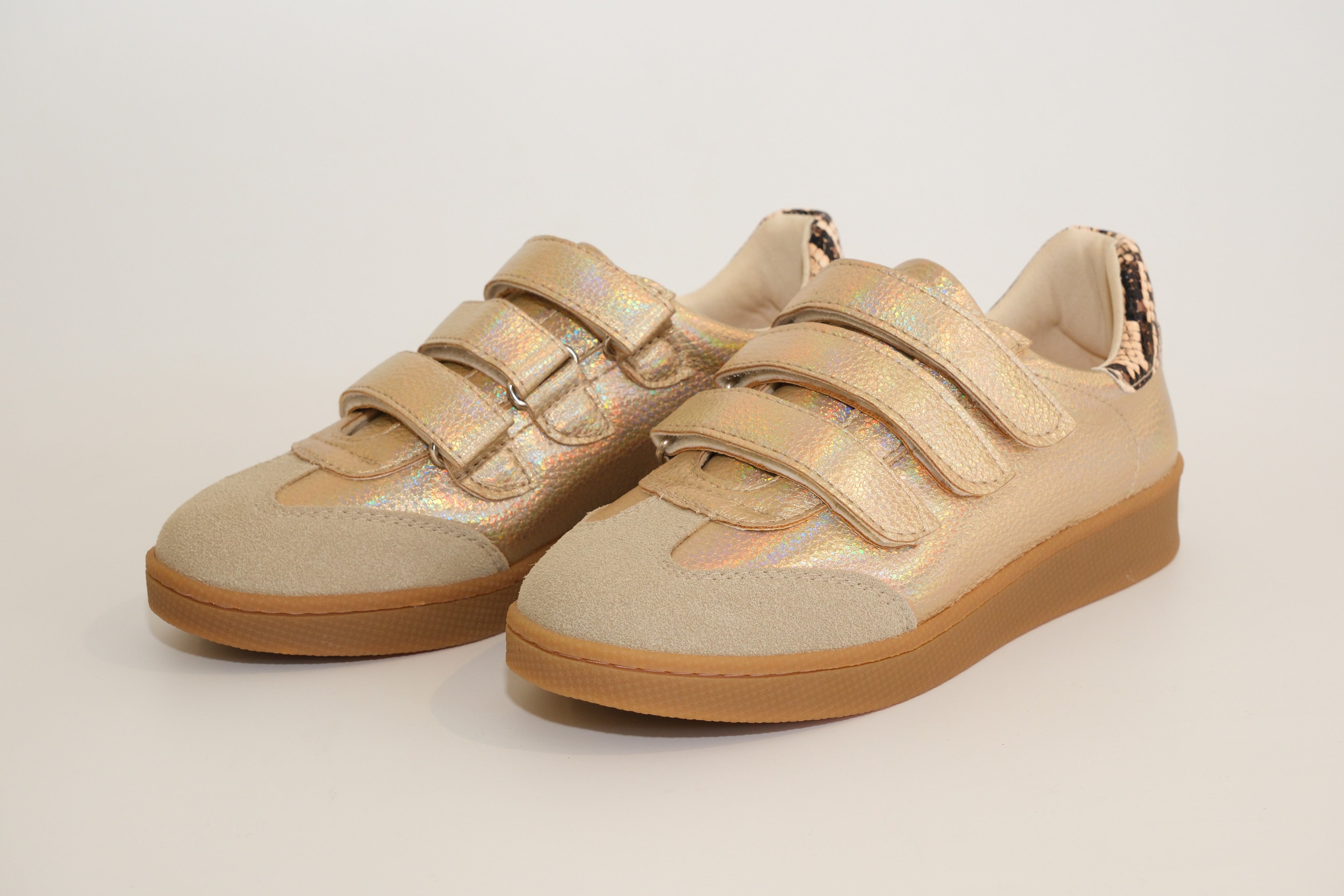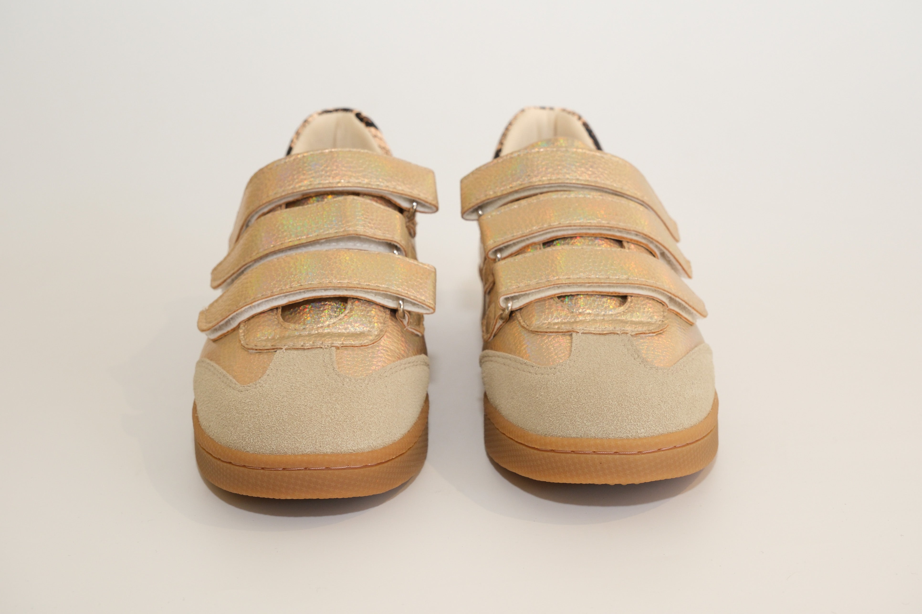 Günlük kullanımda kolaylık ve stil sunan bu gold spor ayakkabı, üç adet cırt cırtlı kapanışı ile ayağa mükemmel uyum sağlar. Arkasındaki özgün desen detayıyla da modern ve dikkat çekici bir görünüm sunar. Konforlu tabanı ile gün boyu rahatlık sağlar.