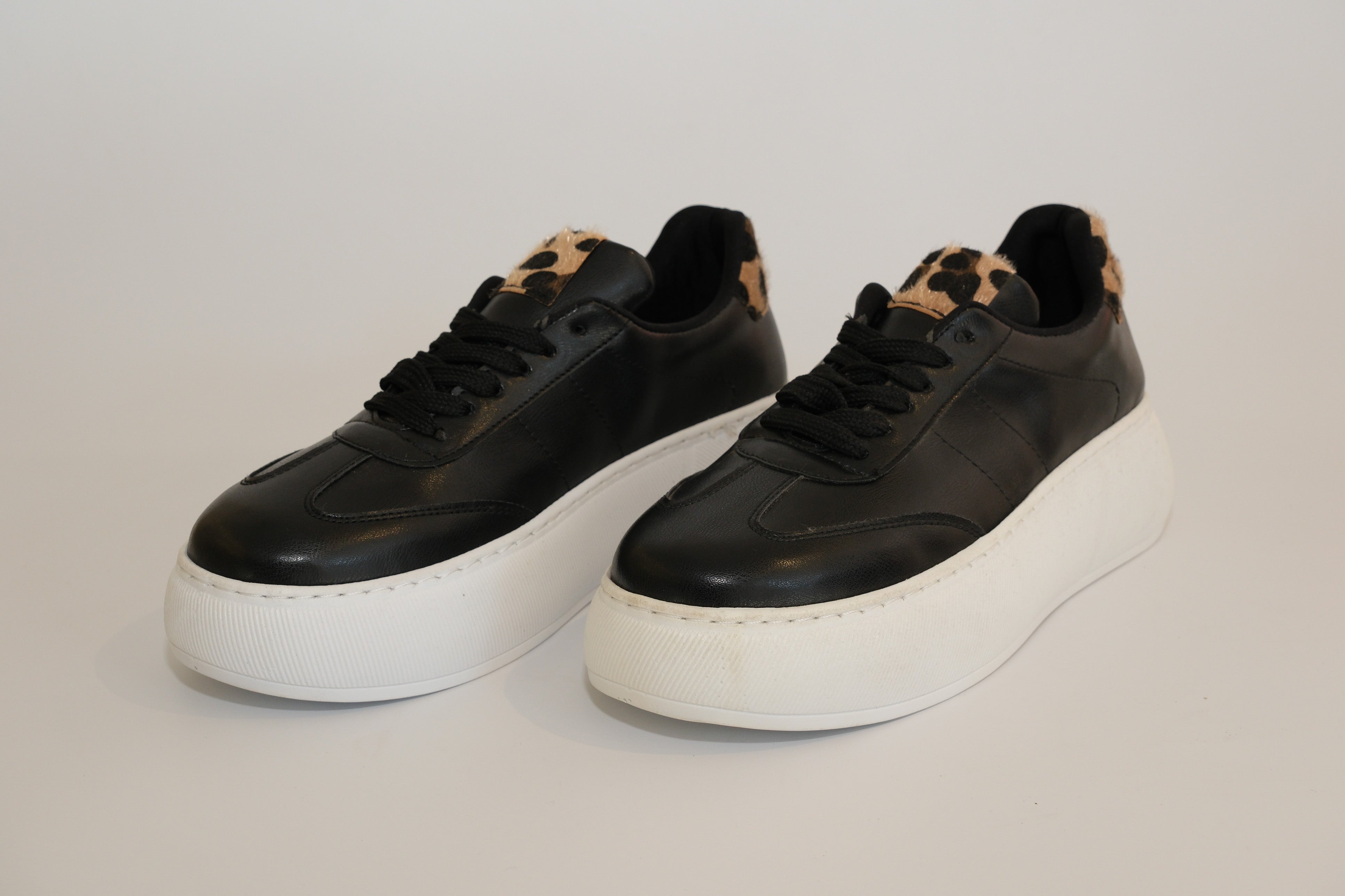 Hem dikkat çekici hem konforlu bu siyah spor ayakkabı, ön ve arka kısmındaki leopar desenleri ile tarzınıza cesur bir dokunuş katar. Kalın beyaz tabanı sayesinde ekstra destek ve rahatlık sunar. Günlük aktivitelerinizde şıklık ve fonksiyonelliği bir arada yaşayın.