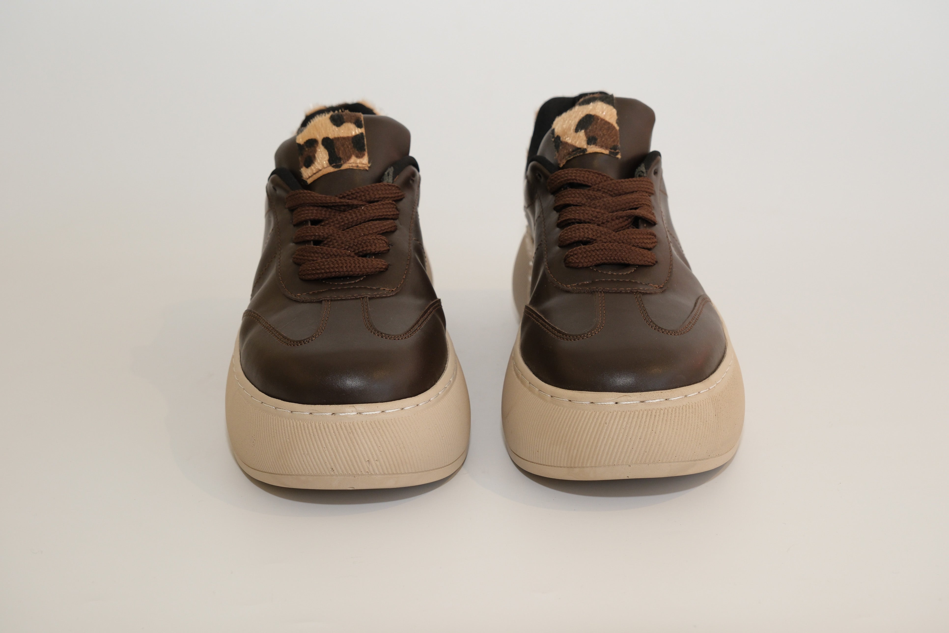 Hem dikkat çekici hem konforlu bu kahverengi spor ayakkabı, ön ve arka kısmındaki leopar desenleri ile tarzınıza cesur bir dokunuş katar. Kalın tabanı sayesinde ekstra destek ve rahatlık sunar. Günlük aktivitelerinizde şıklık ve fonksiyonelliği bir arada yaşayın.