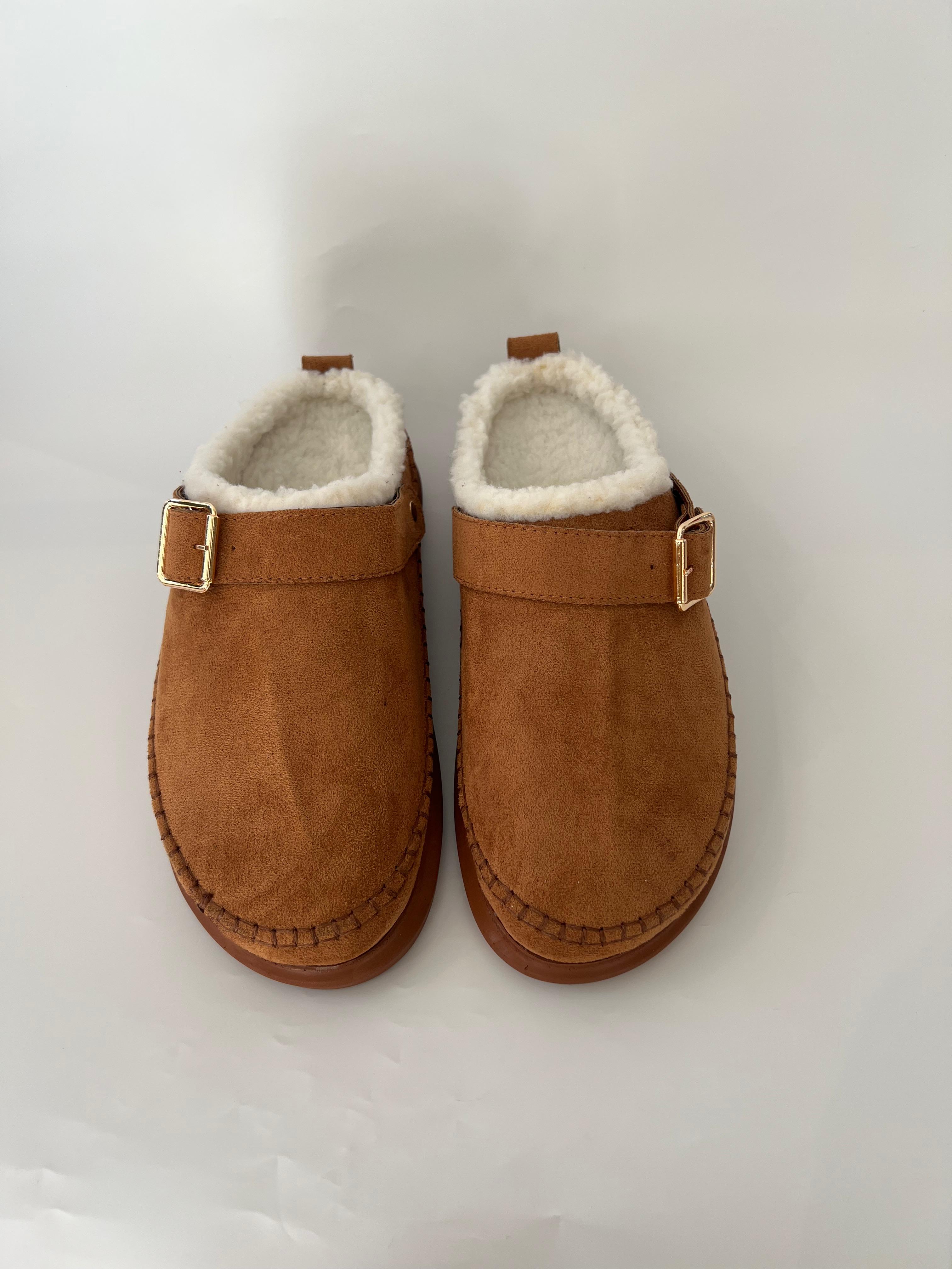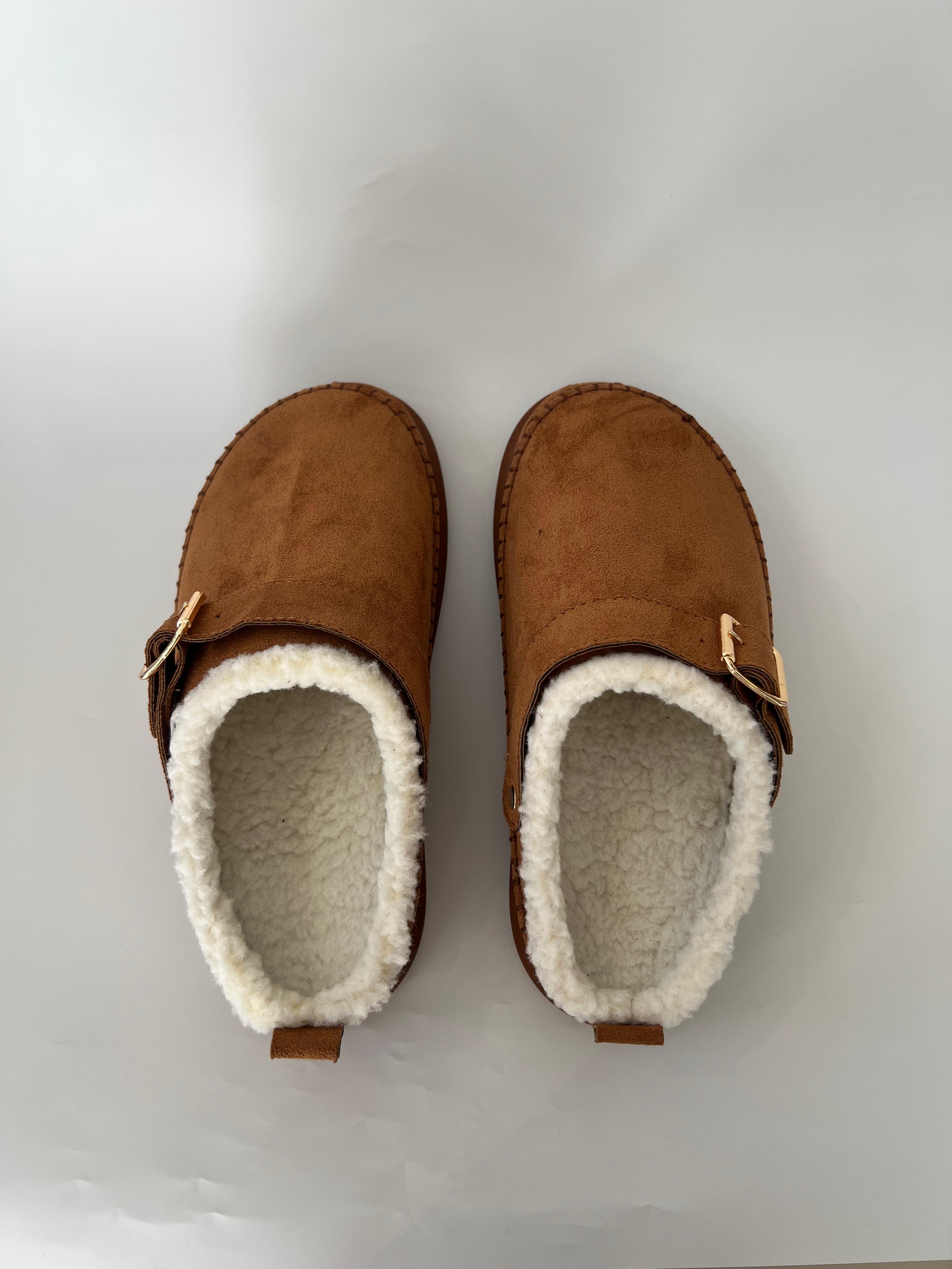 Soğuk günlerde hem şıklığı hem de konforu bir arada yaşatan kahverengi süet kürklü kışlık terlik, yumuşak kürk iç astarıyla maksimum sıcaklık sağlar. Kaliteli süet dokusu ve gold tokalı detayı sayesinde zarif bir görünüme kavuşurken, ergonomik tabanı gün boyu rahat kullanım imkânı sunar. Evde, ofiste ya da kısa dış mekan kullanımlarında şık bir alternatif olarak tercih edilebilir.