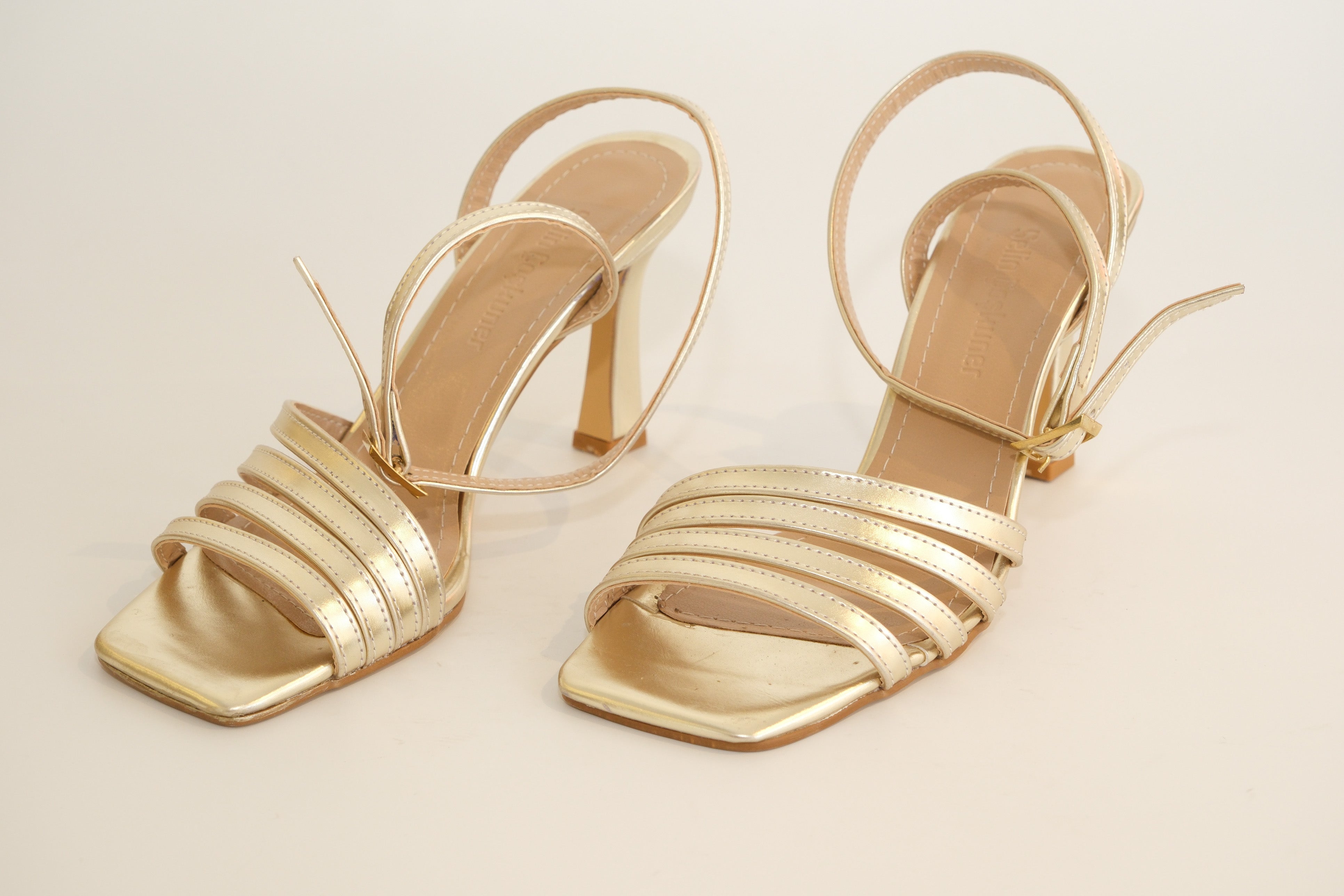 Işıltılı gold rengi ve zarif tasarımıyla dikkat çeken önden açık şeritli bilekten bağlamalı kadeh topuklu ayakkabı, feminen ve modern bir şıklık sunar. Bilekten bağlama detayı ayağı kavrarken, önden açık şerit tasarımı ayakkabıya özgün bir hava katar.