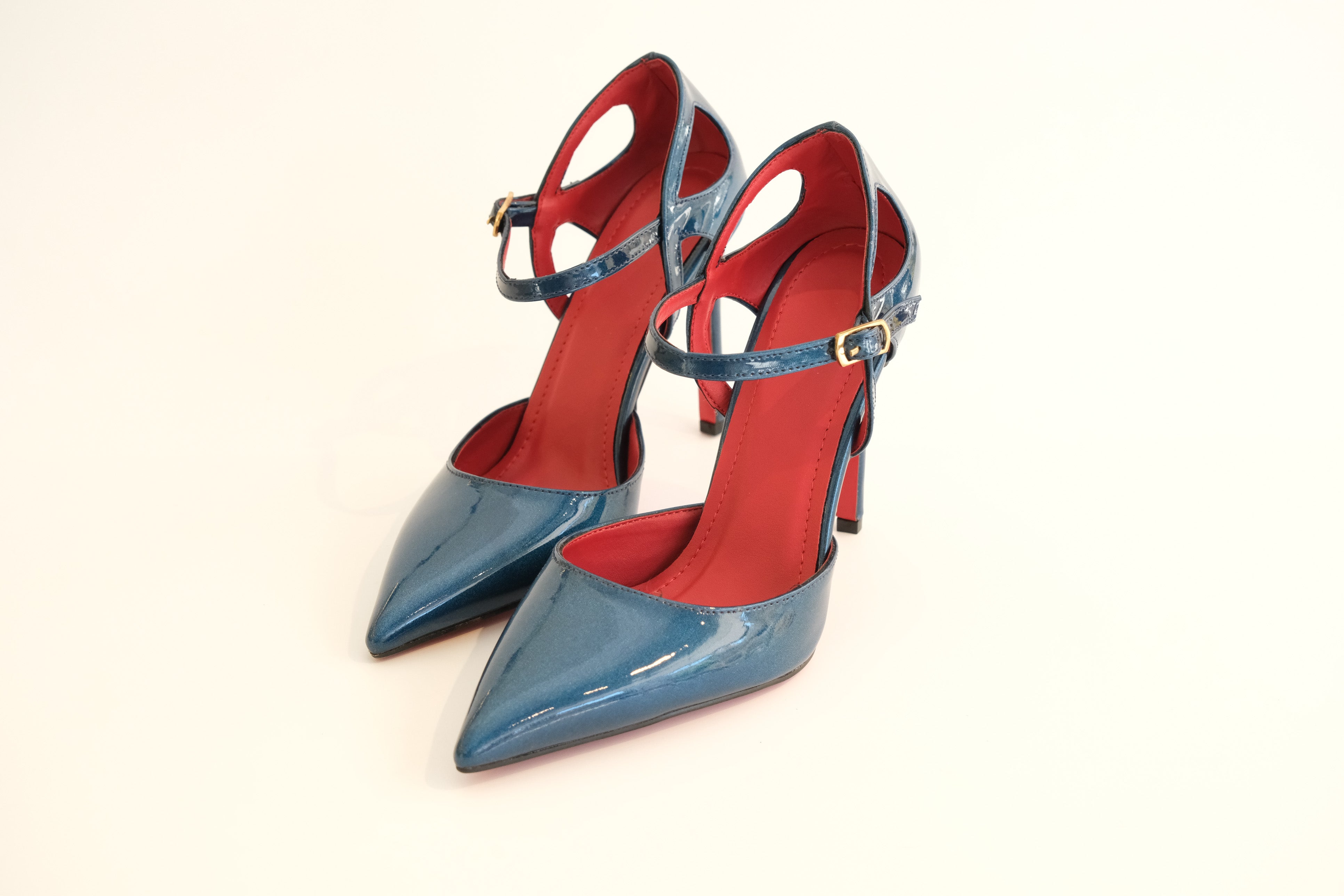 Şıklığın zarafetle buluştuğu bu mavi sivri burunlu bilekten bağlamalı ince topuklu ayakkabı, feminen detayları ve dikkat çekici rengiyle stilinize sofistike bir dokunuş katıyor.