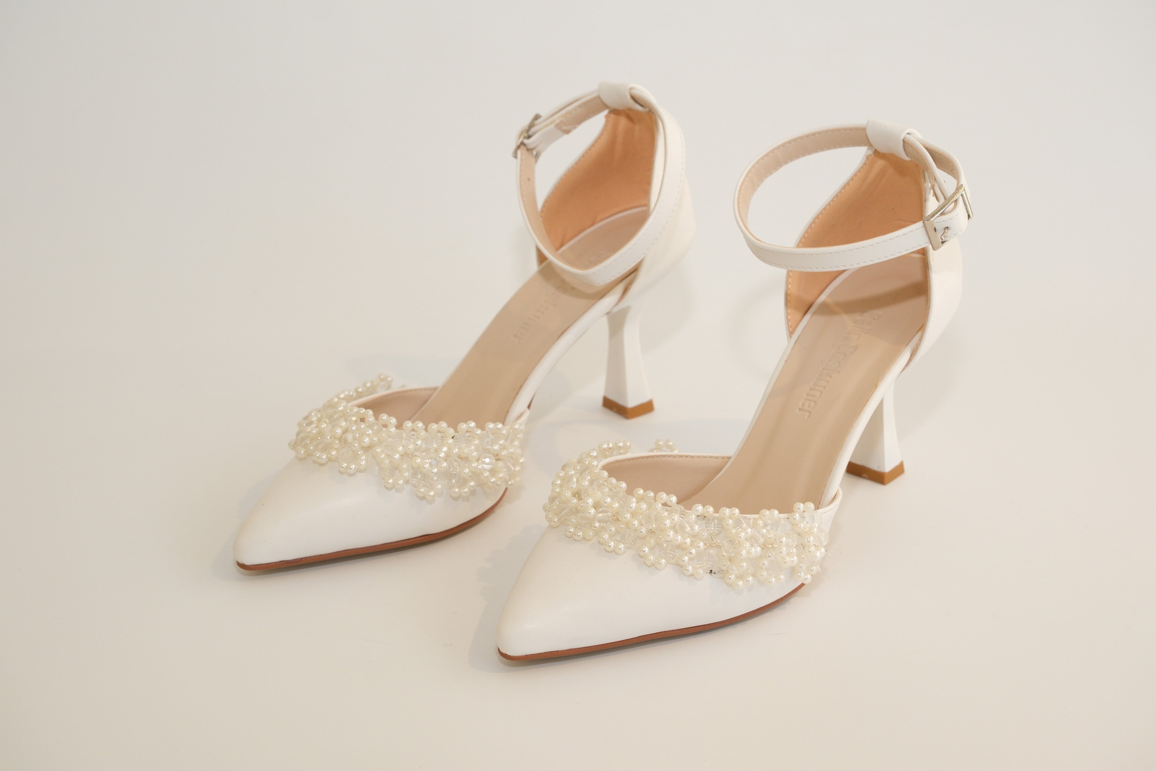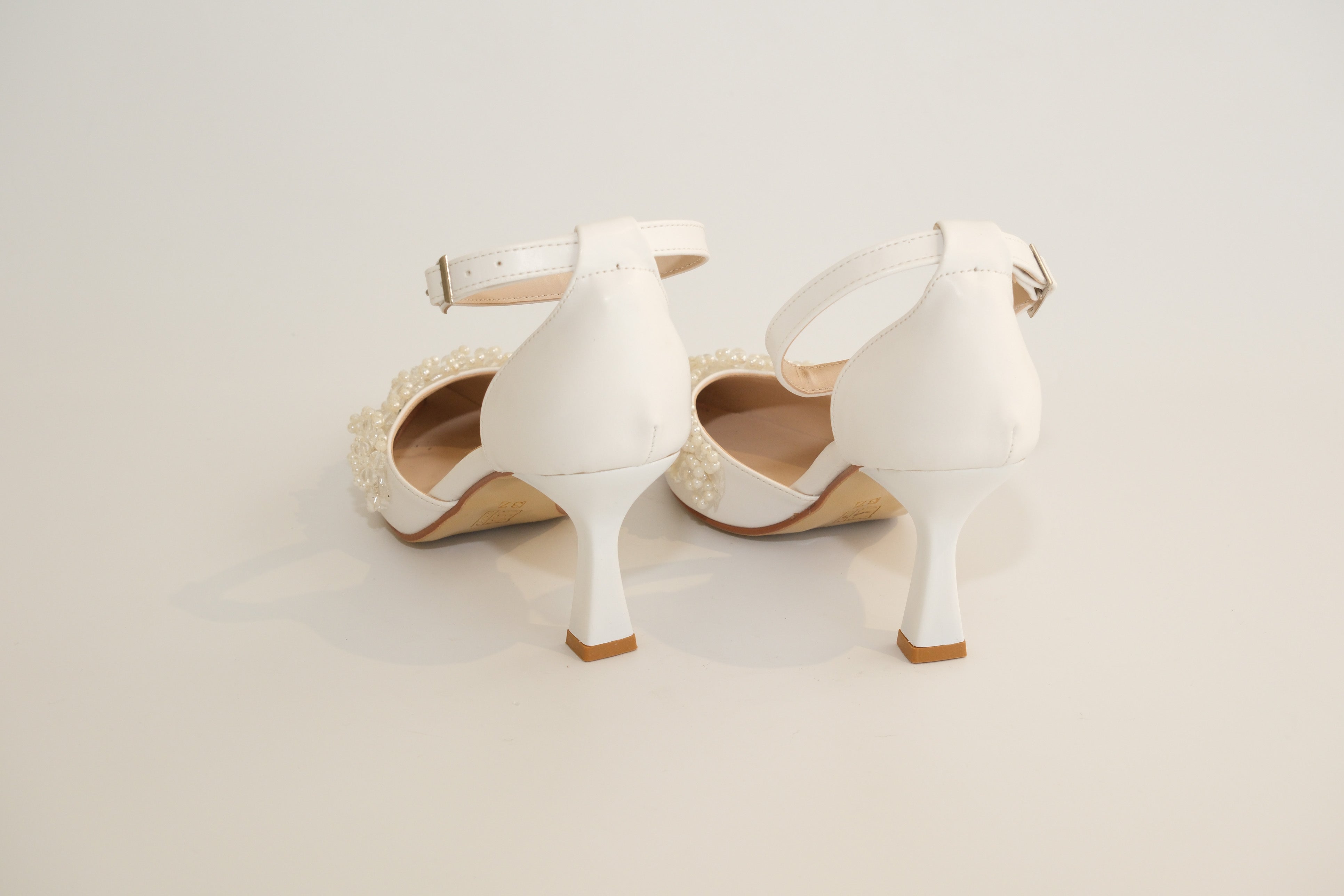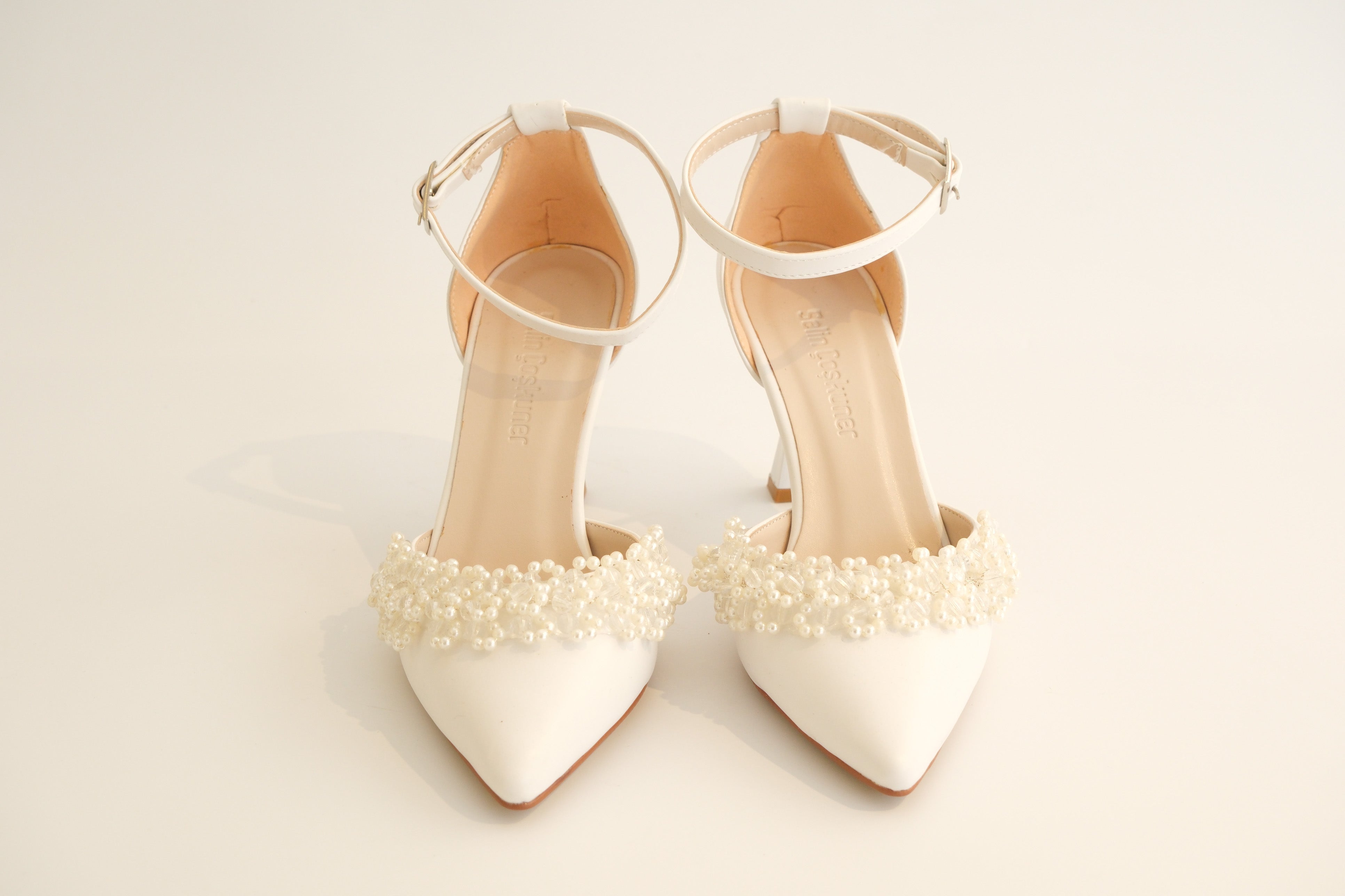 İnci Taş Süslemeli Beyaz Topuklu Ayakkabı