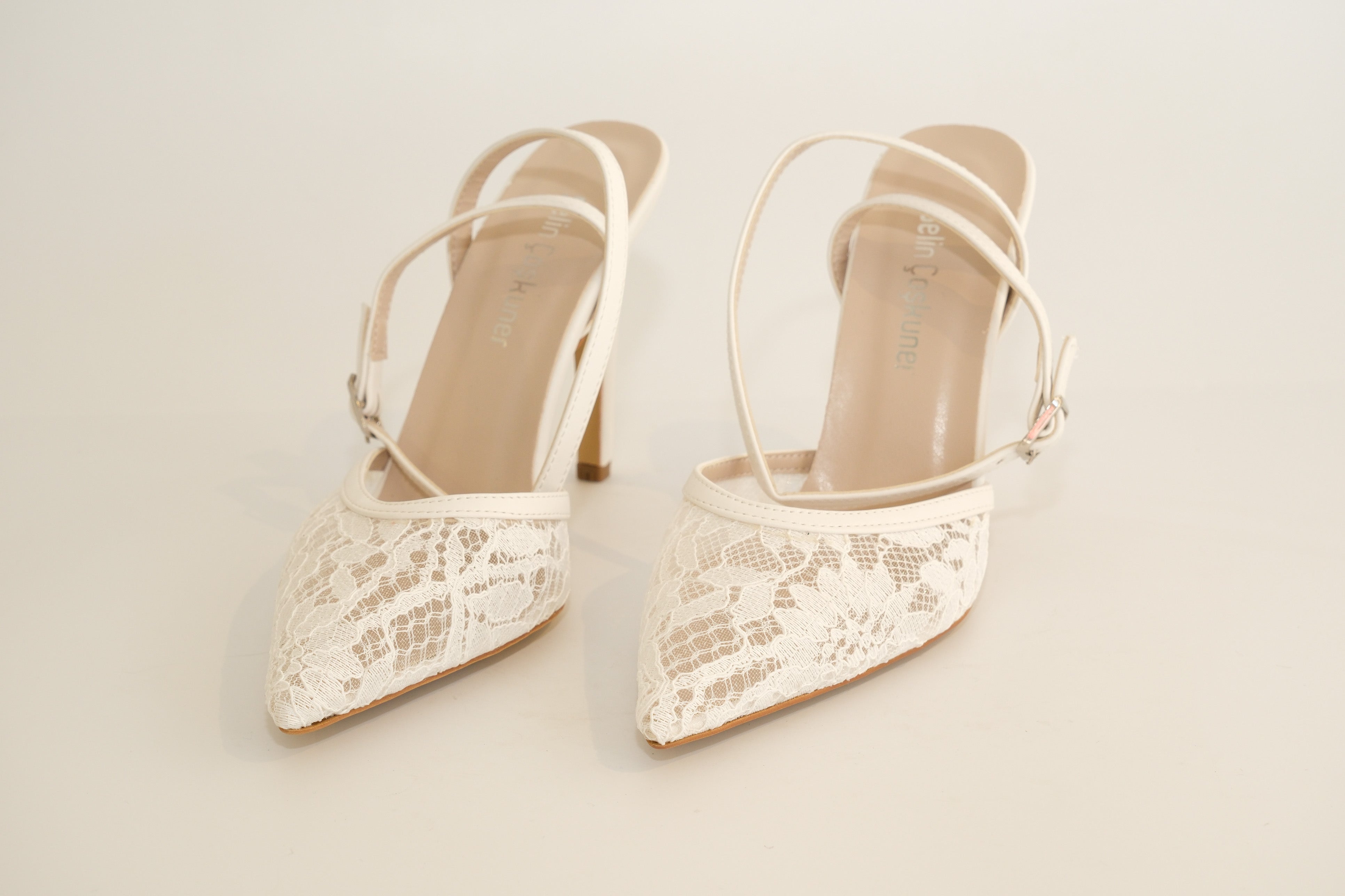 Zarif beyaz dantel detaylarıyla süslenmiş, sivri burun bilekten bağlamalı ince topuklu ayakkabı, feminen ve romantik bir şıklık sunar. Sivri burun tasarımı ayağınızı daha ince ve uzun gösterirken, bilekten bağlama detayı hem güvenli bir kullanım hem de zarif bir dokunuş sağlar.