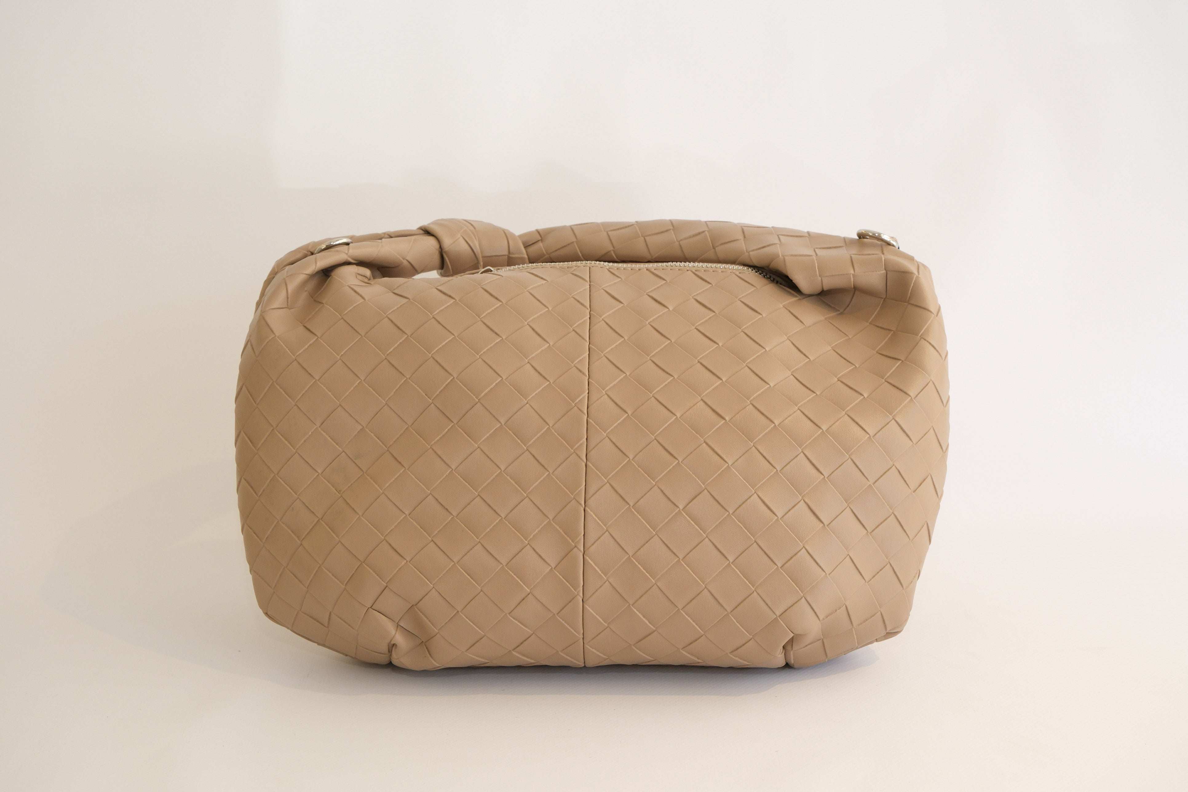 Bej Deri Görünümlü, Desenli Düğüm Saplı ve Uzun Askılı Çanta